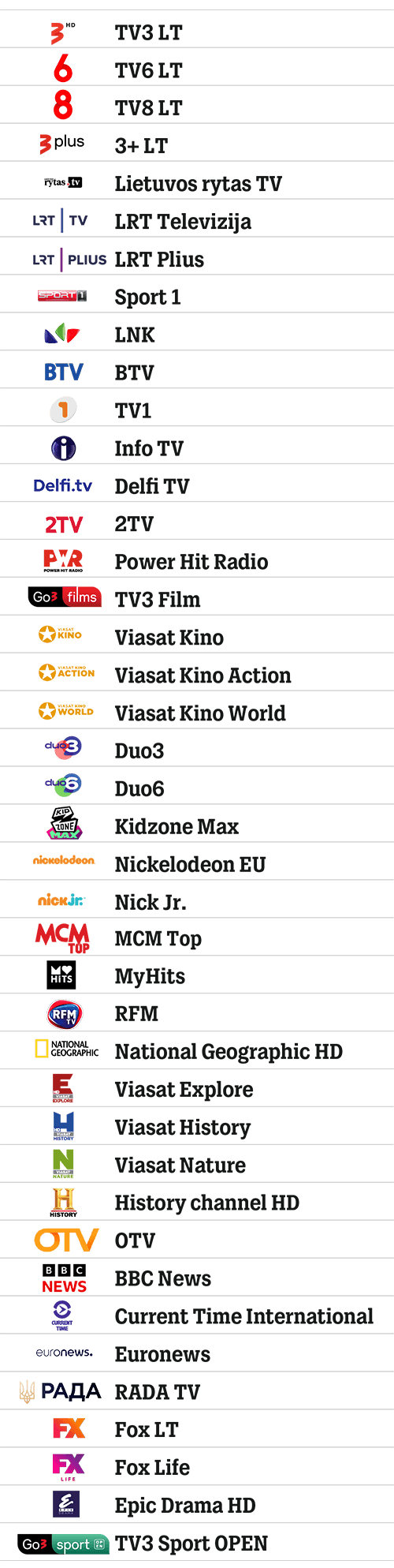 Kanalų sąrašas: Eurosport HD, Eurosport2 HD, Discovery HD, TLC HD, Investigation Discovery, Food Network, Travel Channel, Animal Planet, HGTV (Home&Garden TV).