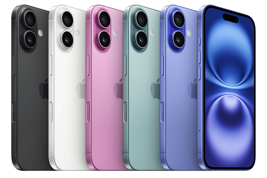 Ekranų kampai užapvalinti. Matuojant kaip stačiakampį, ekrano įstrižainė yra 6,12 colio („iPhone 16“), 6,69 colio („iPhone 16 Plus“), 6,27 colio („iPhone 16 Pro“) arba 6,86 colio („iPhone 16 Pro Max“). Faktinė peržiūros sritis yra mažesnė.