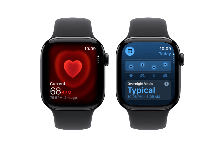 Naujojo Apple Watch Series 11 ekranas – atsparesnis įbrėžimams. Tai ploniausias Apple Watch – patogus dėvėti ir dieną, ir miegant. Patobulinti inovatyvūs širdies ritmo jutikliai, riešo temperatūros jutiklis. Gali identifikuoti tendencijas ir įspėti apie padidėjusį kraujo spaudimą.