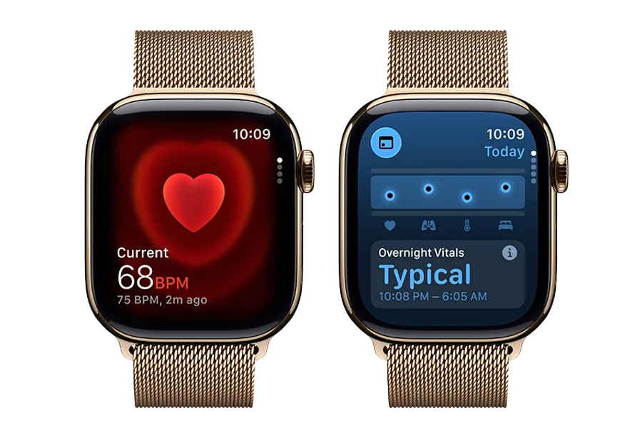 Naujojo Apple Watch Series 11 ekranas – atsparesnis įbrėžimams. Tai ploniausias Apple Watch – patogus dėvėti ir dieną, ir miegant. Patobulinti inovatyvūs širdies ritmo jutikliai, riešo temperatūros jutiklis. Gali identifikuoti tendencijas ir įspėti apie padidėjusį kraujo spaudimą.
