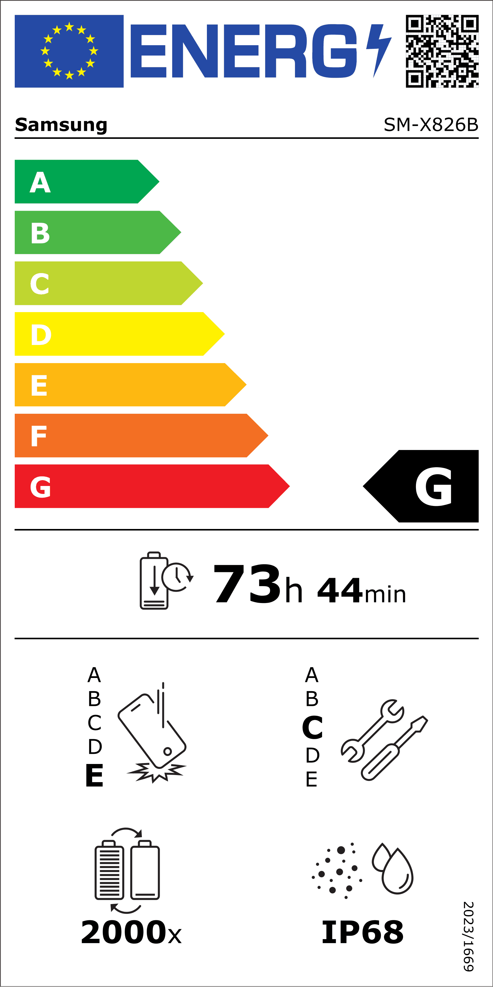 Etiketėje vaizduojama energinio efektyvumo skalė su spalvomis ir raidėmis nuo A iki G. A (žalia) klasė laikoma energetiškai efektyviausia, o G (raudona) – mažiausiai efektyvi.
