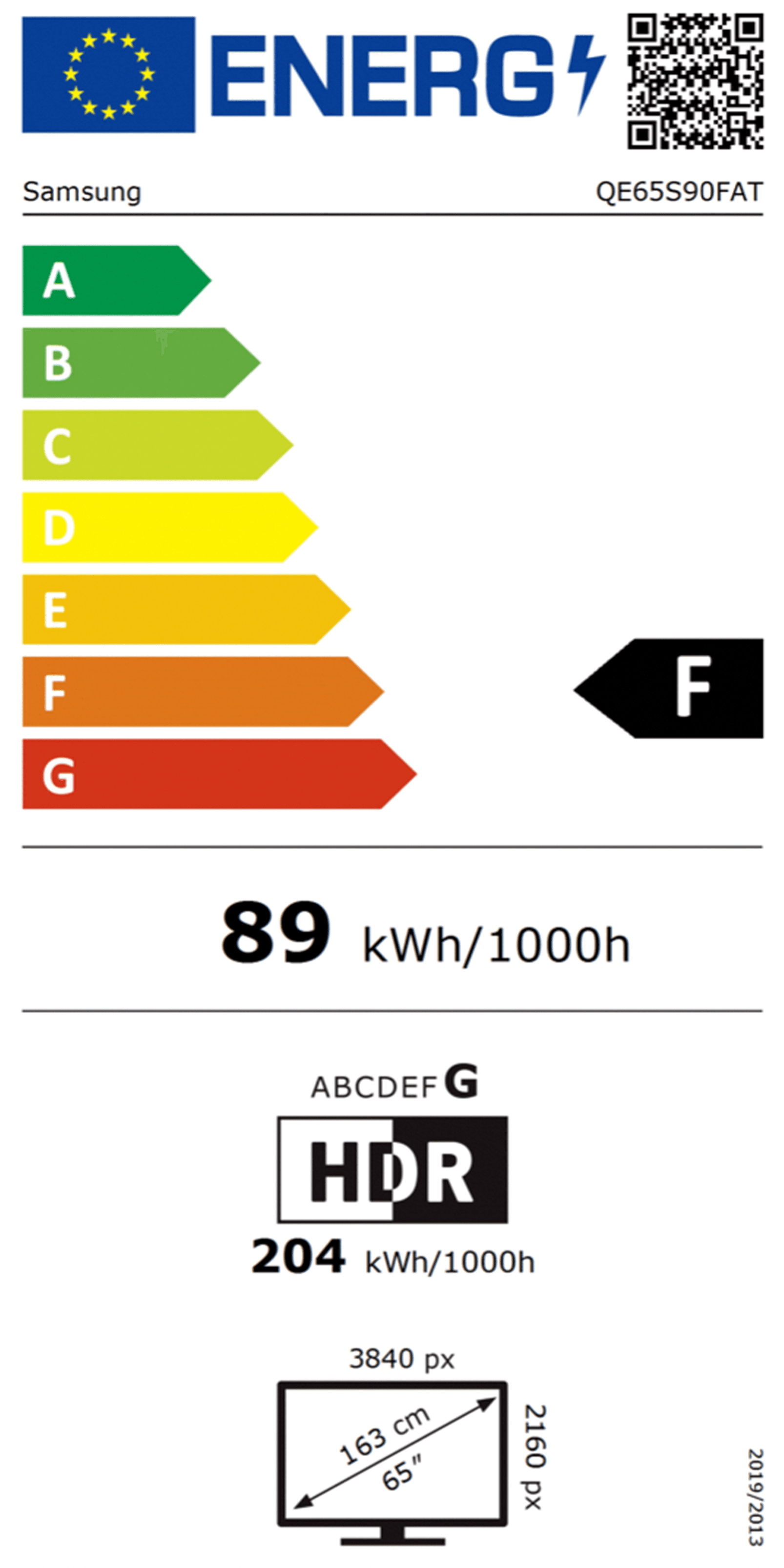 Etiketėje vaizduojama energinio efektyvumo skalė su spalvomis ir raidėmis nuo A iki G. A (žalia) klasė laikoma energetiškai efektyviausia, o G (raudona) – mažiausiai efektyvi.