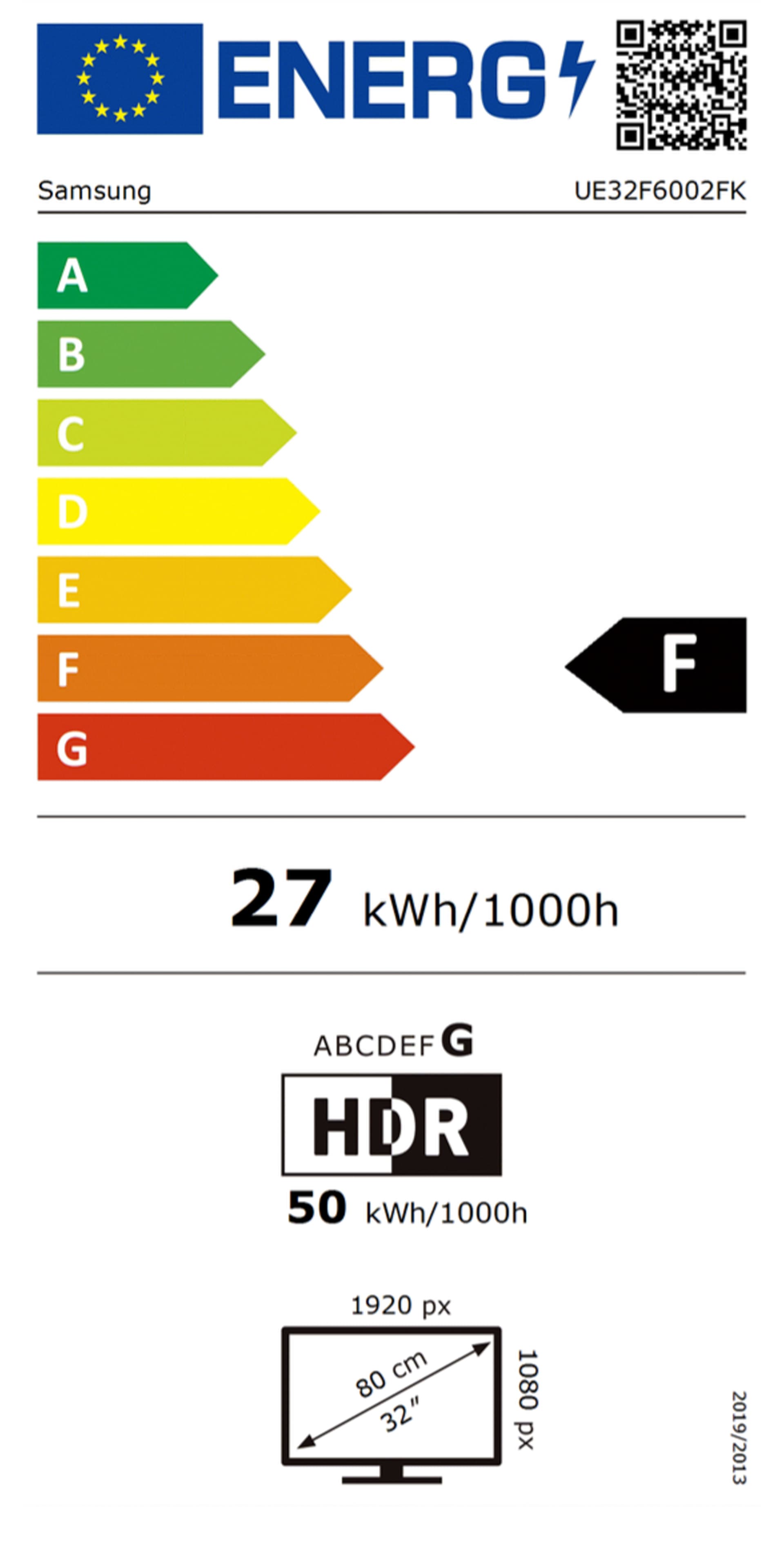 Etiketėje vaizduojama energinio efektyvumo skalė su spalvomis ir raidėmis nuo A iki G. A (žalia) klasė laikoma energetiškai efektyviausia, o G (raudona) – mažiausiai efektyvi.