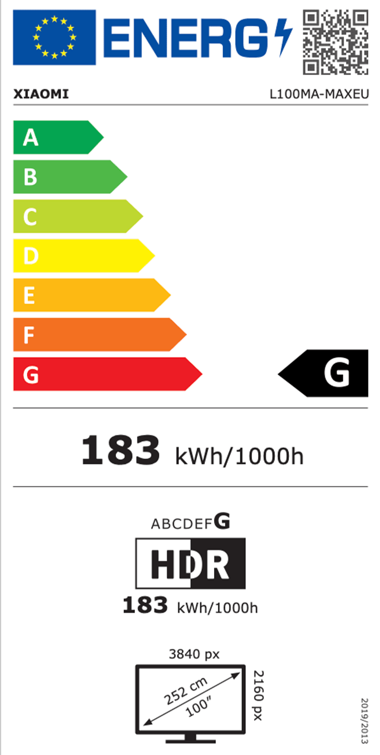 Etiketėje vaizduojama energinio efektyvumo skalė su spalvomis ir raidėmis nuo A iki G. A (žalia) klasė laikoma energetiškai efektyviausia, o G (raudona) – mažiausiai efektyvi.