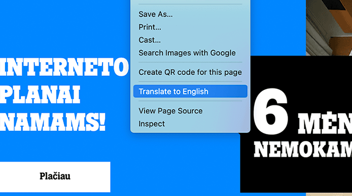 Откройте tele2.lt через браузер Google Chrome и в любой точке экрана нажмите на правую кнопку мыши. Выберите Translate to English, и страница автоматически будет переведена на английский язык. Тогда нажмите на Choose another language и выберите в списке русский или другой нужный вам язык.