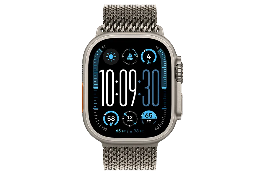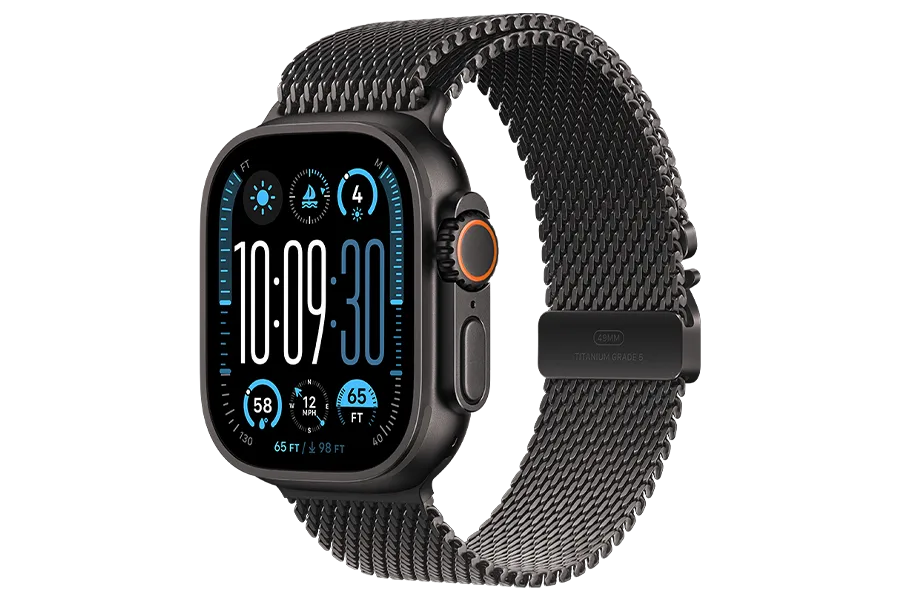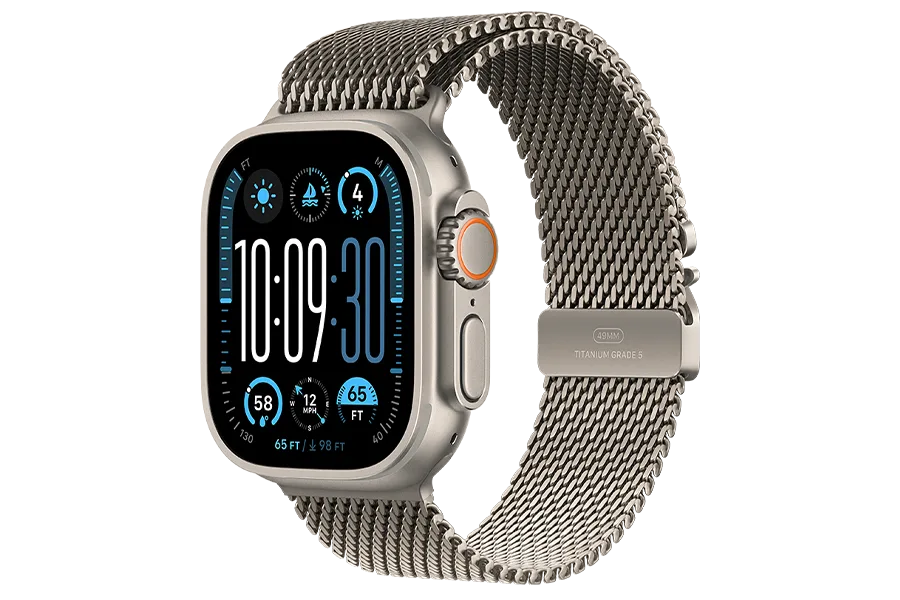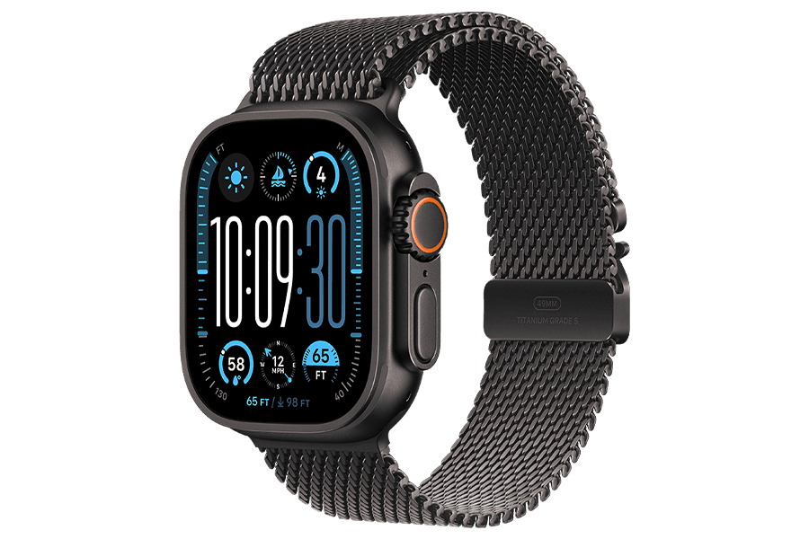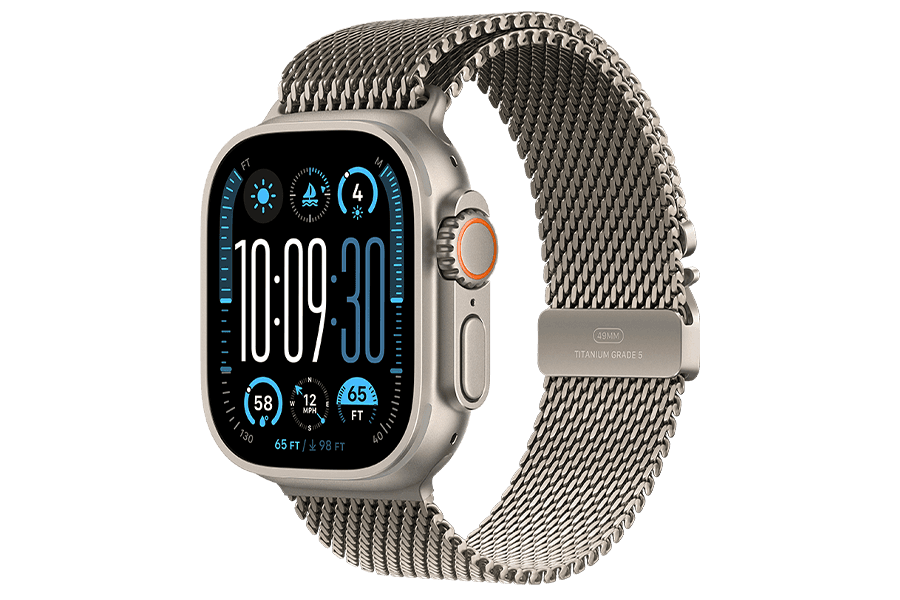 Apple Watch Ultra 2 – tvirtas ir galingas laikrodis su aviacinės klasės titano korpusu. Jo nerūdijančio plieno apyrankė prideda solidumo, o „S9“ lustas užtikrina, kad laikrodis galėtų lydėti net į netikėčiausias sporto šakas ar nuotykius. Didelis ekranas leidžia lengvai valdyti visas funkcijas, laikrodžio ciferblatas šonuose gali rodyti dinaminę informaciją, tokią kaip aukštis, gylis ar sekundės. Valdymą palengvina ir dvigubo bakstelėjimo funkcija.