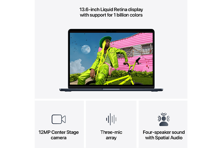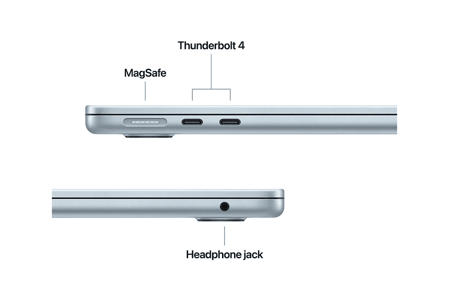 Vos 1,23 kg svorio kompiuteryje veikia kasdieną palengvinanti Apple Intelligence ir kokybiška kamera vaizdo skambučiams. Modelyje įdiegta magnetinė MagSafe krovimo jungtis, taip pat yra dvi USB-C jungtys ir klasikinis ausinių lizdas.