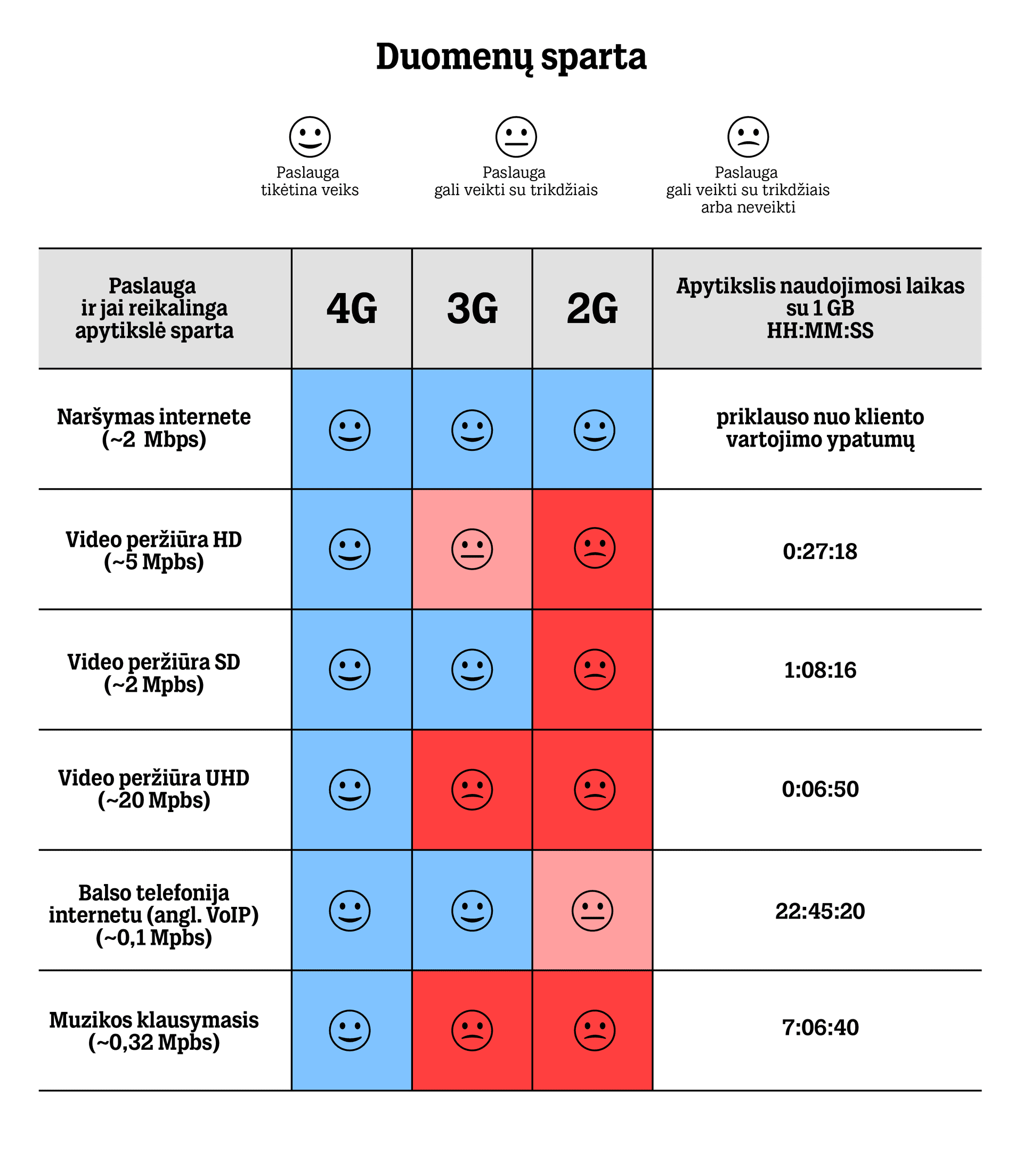 Žemiau pateikiame keletą praktinių pavyzdžių apie duomenų poreikį naudojantis atitinkamomis interneto paslaugomis (lentelėje pateikti duomenys yra apytiksliai):
